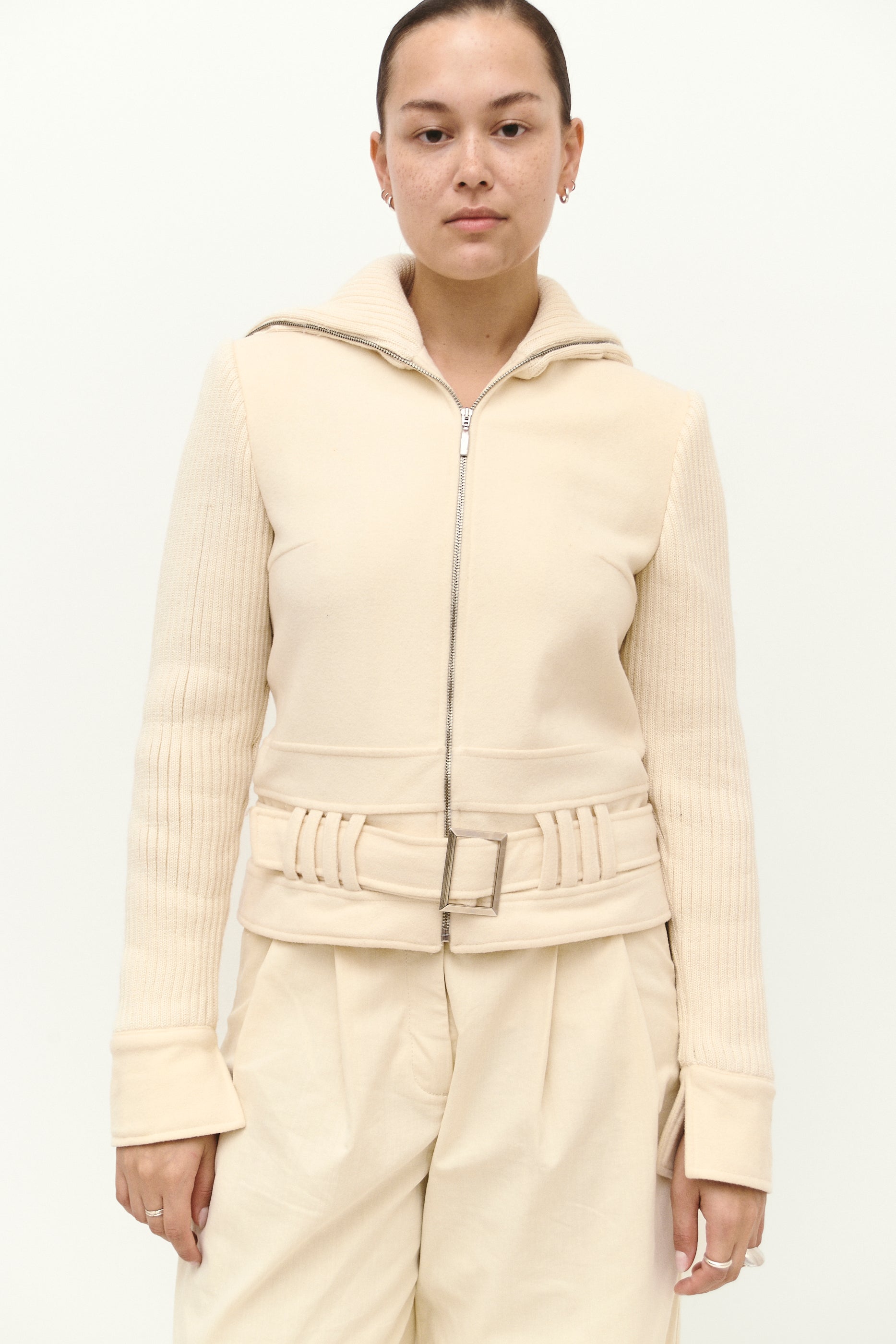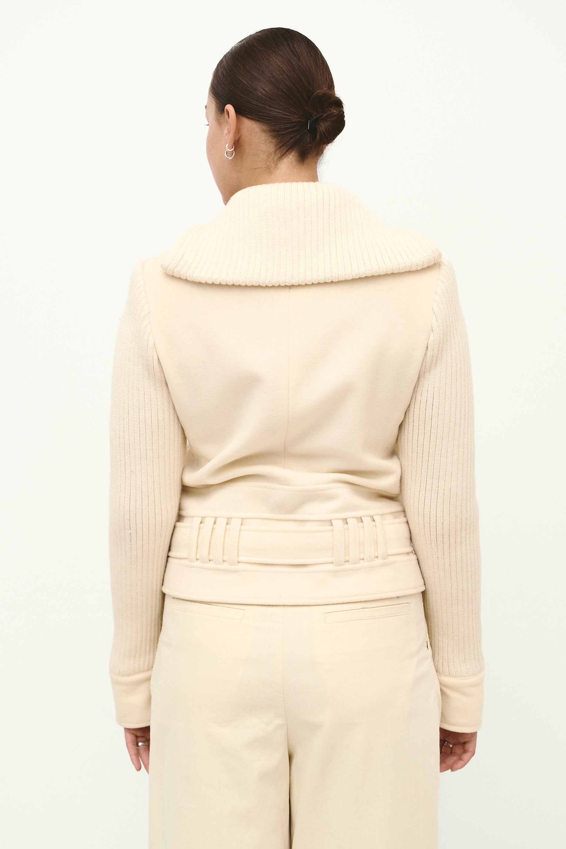 Cream wool jacket with ribbed sleeves and collar, featuring a front buckle and zipper closure.