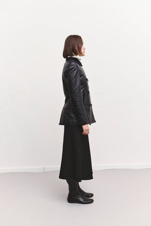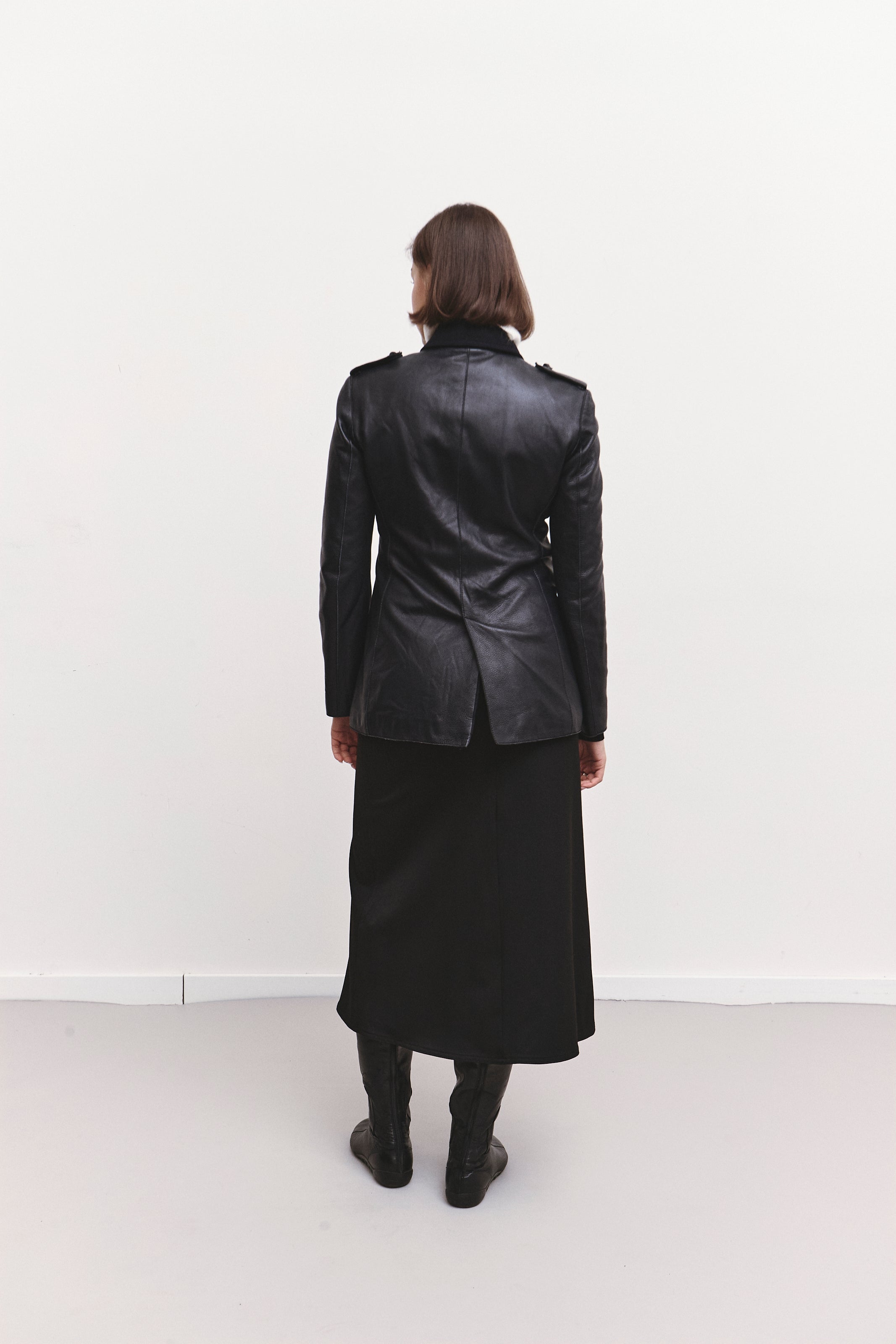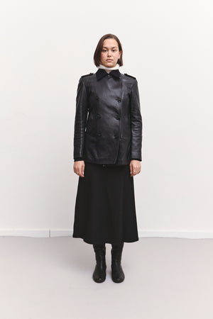 Featuring a double-breasted front, sculpted paneling and button details that give it a refined, tailored silhouette. Crafted from supple, grained leather — a timeless piece with subtle attitude