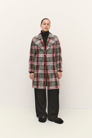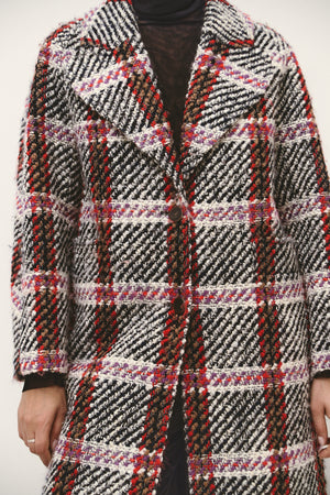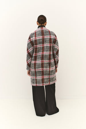 Checkered wool Carven coat featuring two large front pockets and a classic button closure.