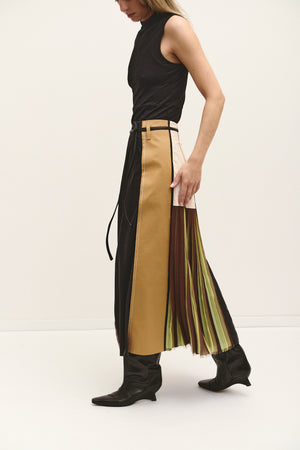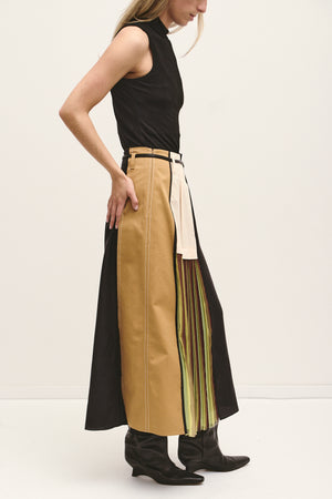 Avant-garde patchwork maxi skirt by Dorothee Schumacher. Crafted from a mix of structured panels and flowing pleats. Features contrast sections in camel, black, and cream with a multicolored pleated underlayer in shades of brown, lime, and soft yellow.