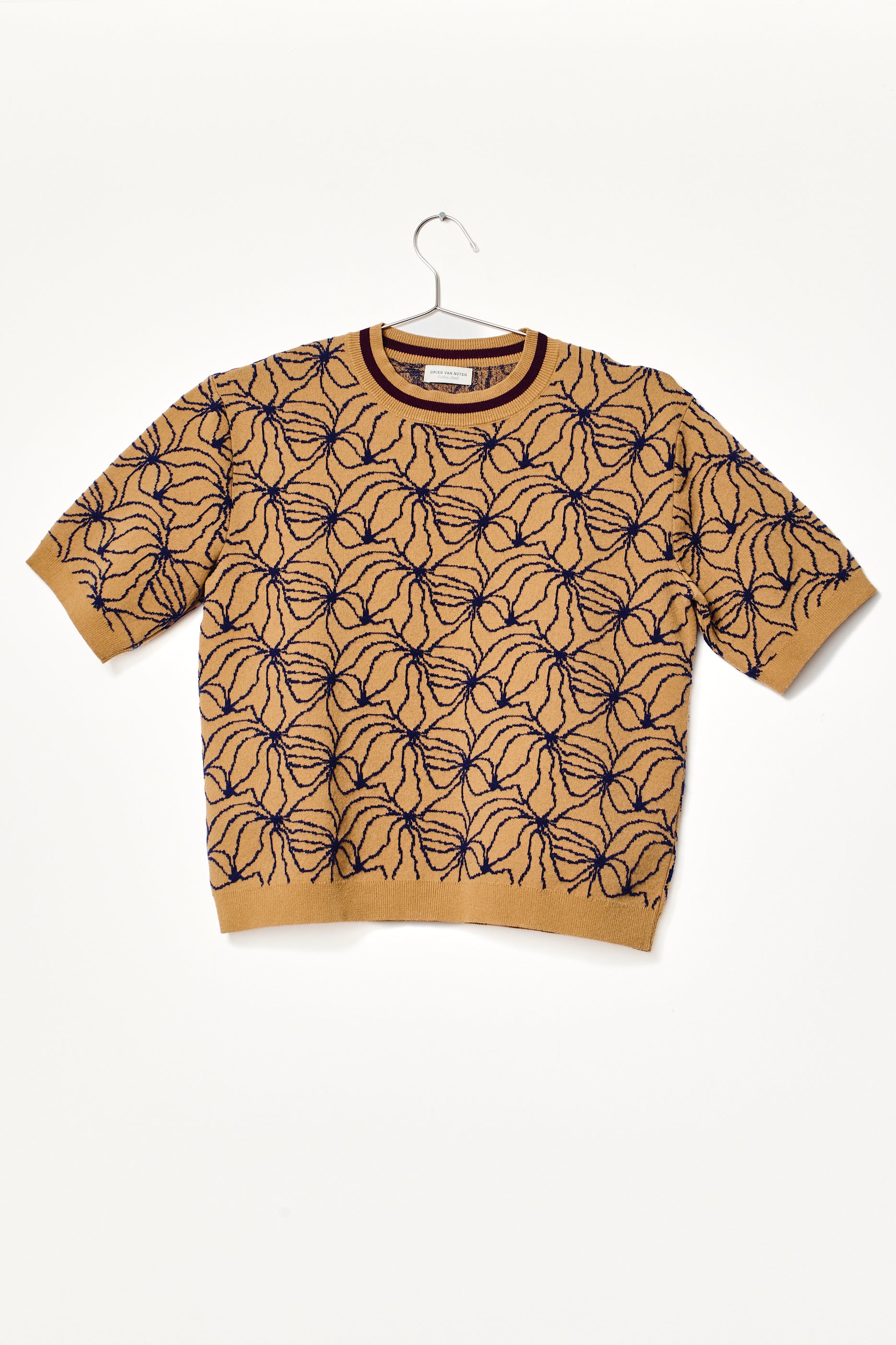 Dries Van Noten camel knit featuring a blue floral design and red detailing around the collar. A playful yet refined piece — easy to dress up with a skirt or wear casually with pants.