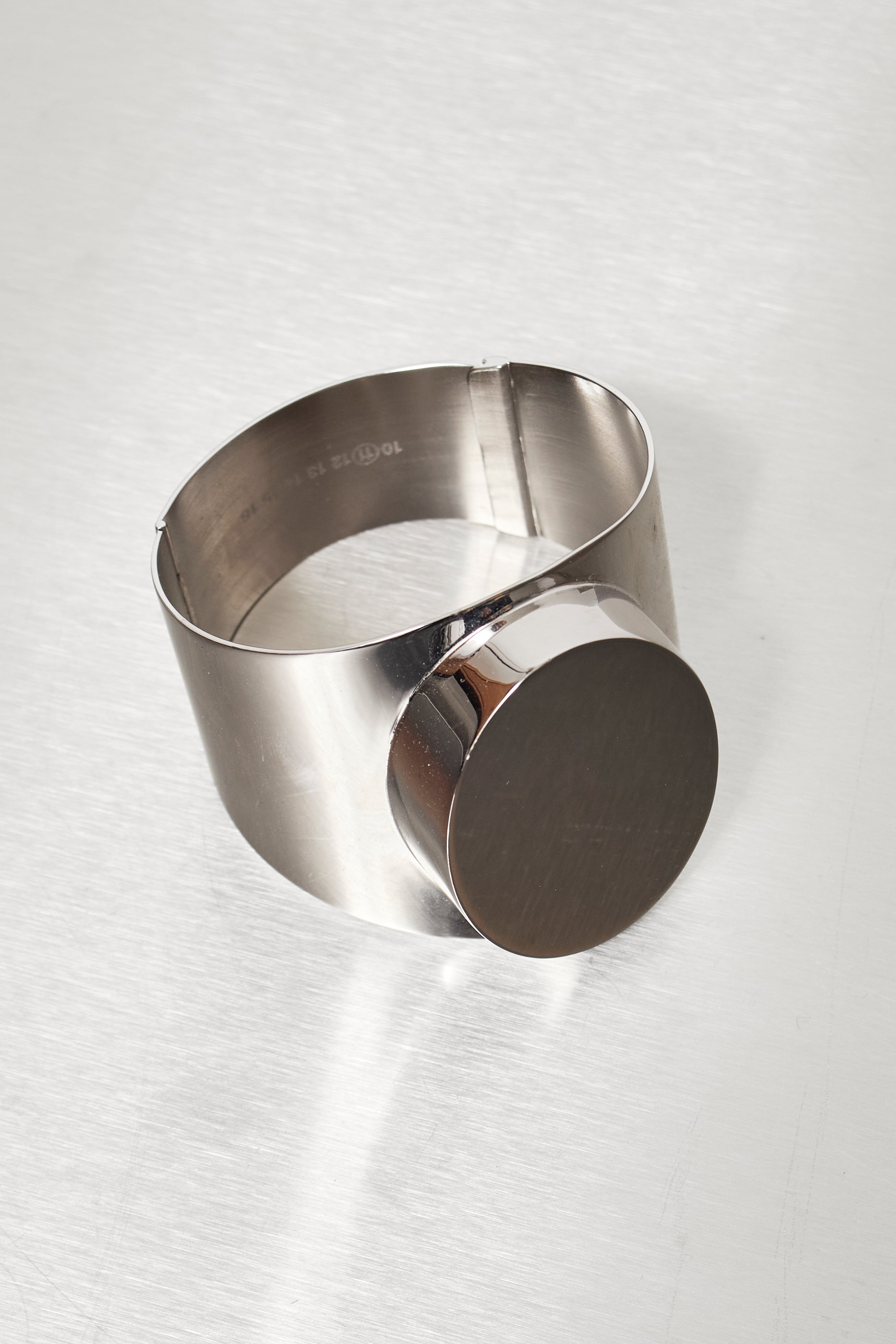 Striking sculptural cuff by Maison Margiela, featuring the house’s signature avant-garde minimalism. Made from polished silver-tone metal with a bold circular centerpiece, this piece feels both architectural and timeless. A true statement accessory that elevates any look — from pared-back tailoring to evening wear.