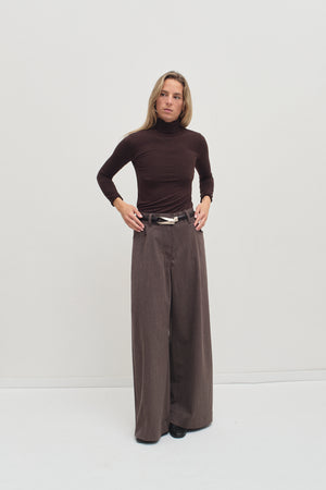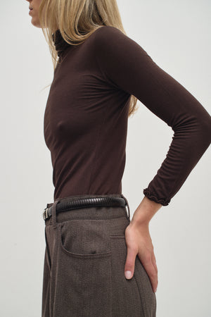 Brown long-sleeve top crafted from a soft, stretchy fabric, featuring a ruffle-trimmed turtleneck and a fitted silhouette for an effortlessly chic and comfortable look.