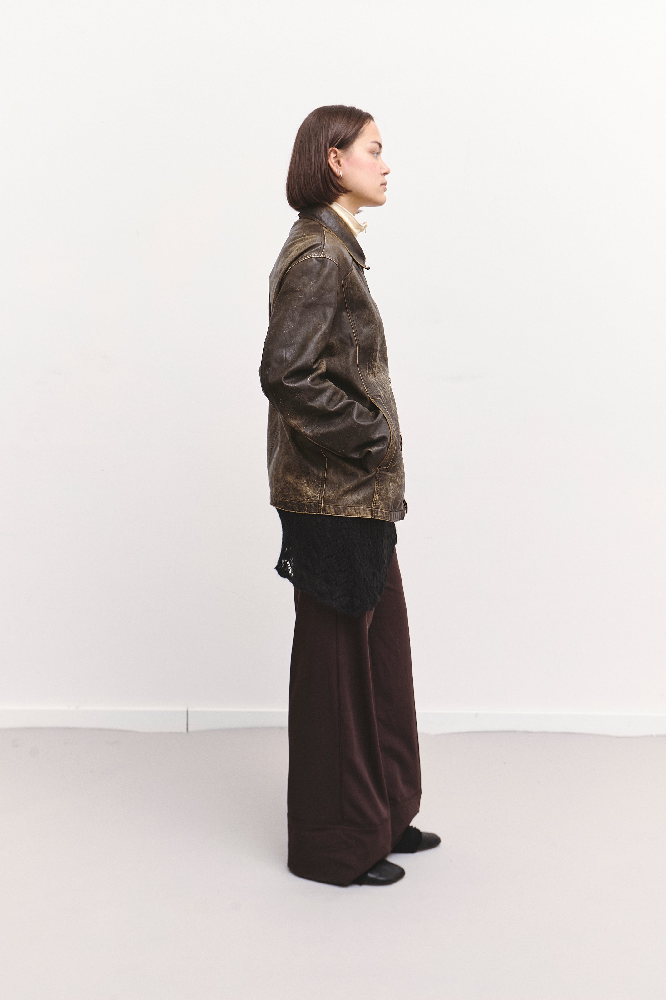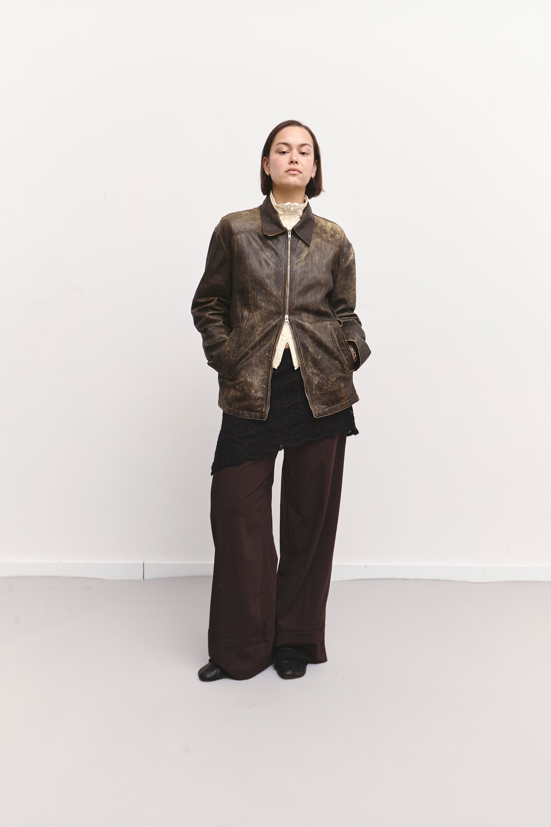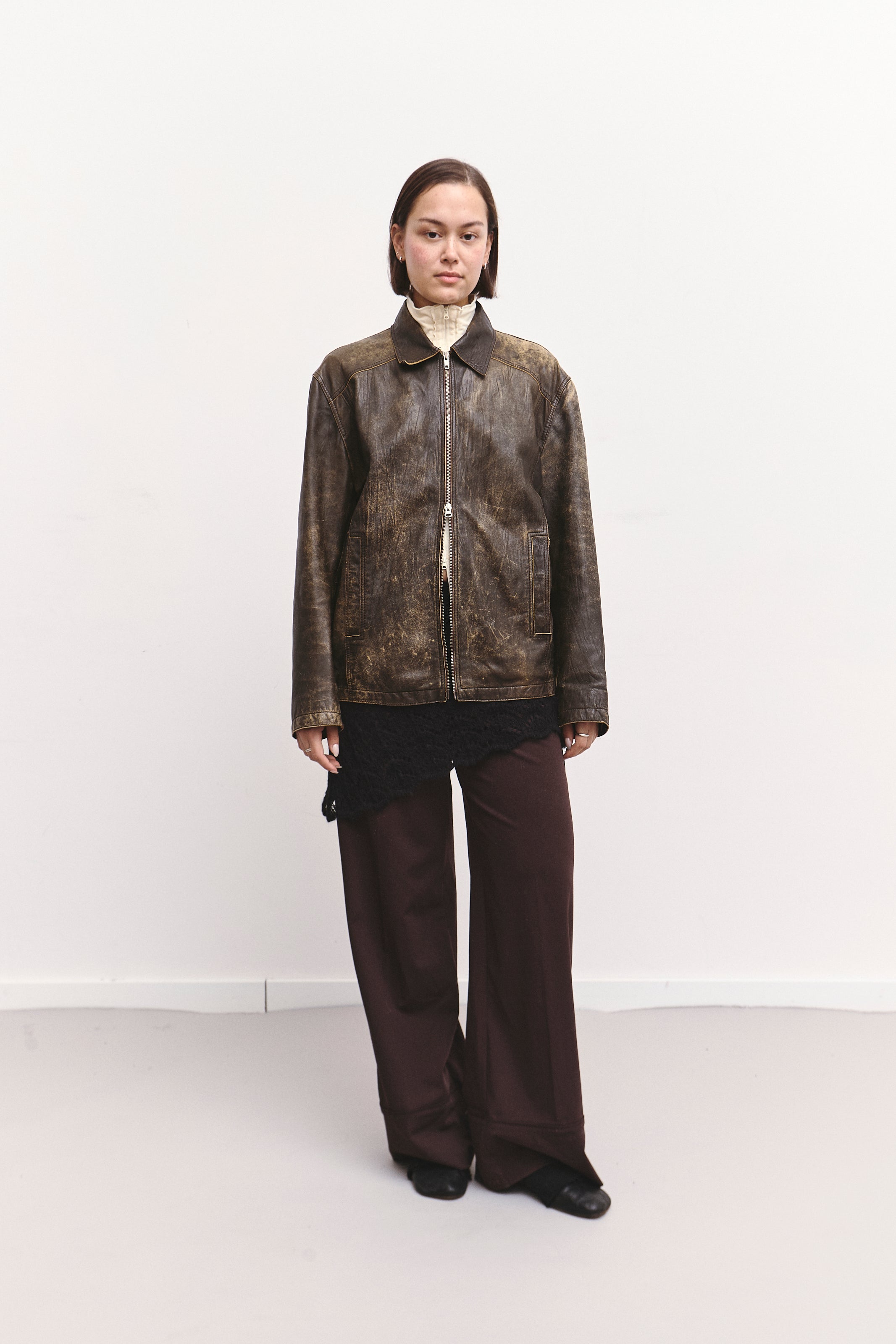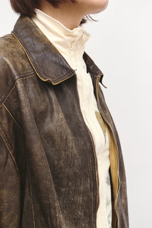 A lightweight distressed leather jacket with a two-way zipper and a relaxed, slightly oversized silhouette. Soft, flexible leather with natural wear that adds character. Easy to layer and perfect for an effortless, lived-in look.