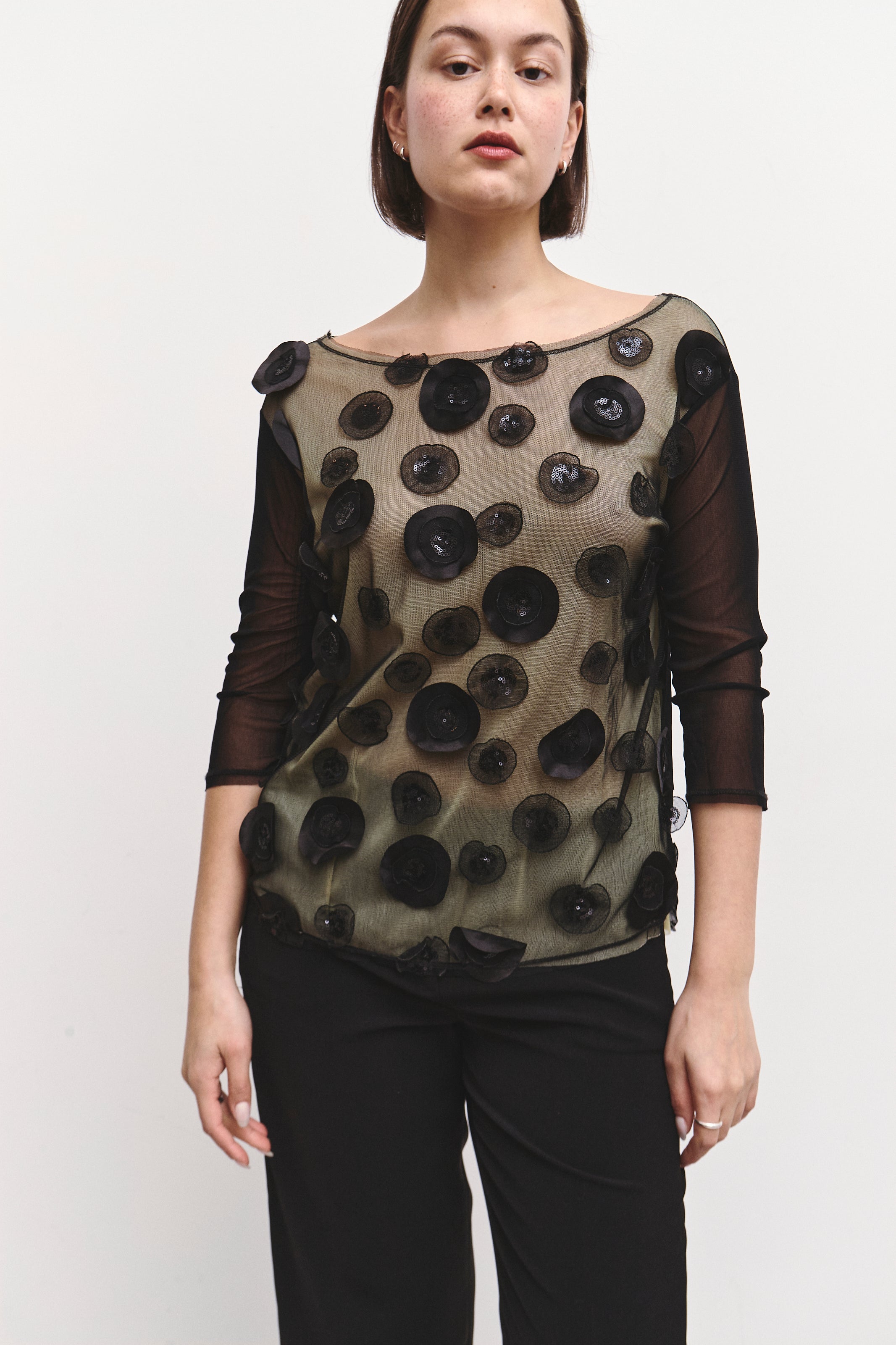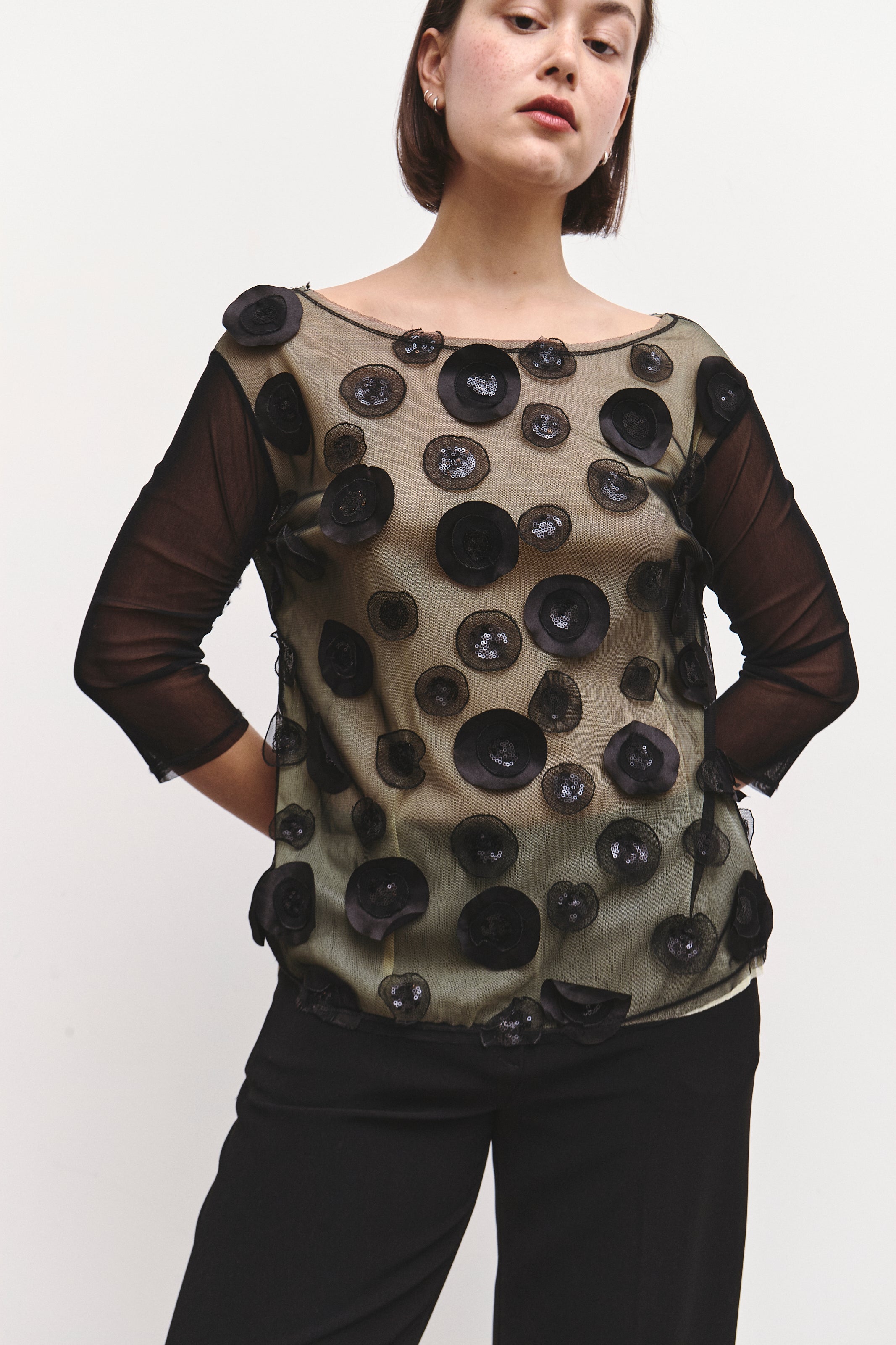 A delicate sheer top adorned with hand-applied circular floral appliqués and sequins.