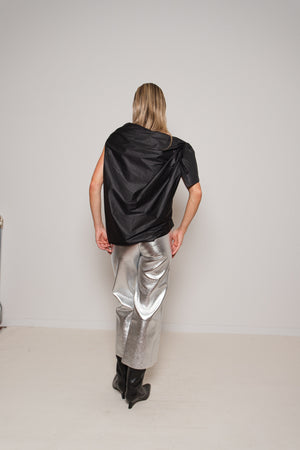 Oversized asymmetrical top with a shoulder tie that can be styled multiple ways.