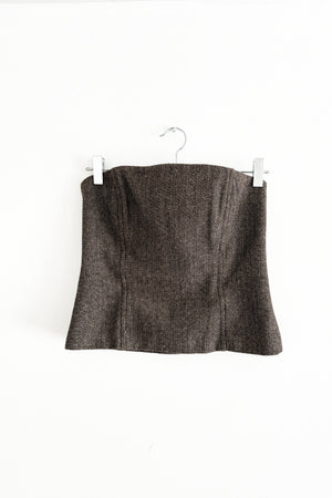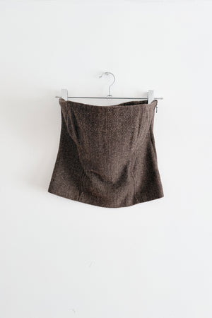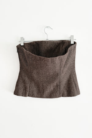 Corset-style bandeau top in a brown and beige wool-knit design. Featuring a structured, suit-inspired silhouette with a subtle fisherman texture, it blends tailored sophistication with a modern, effortless edge.
