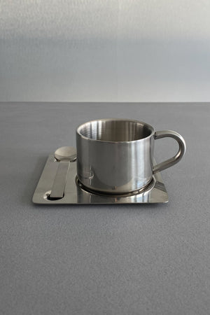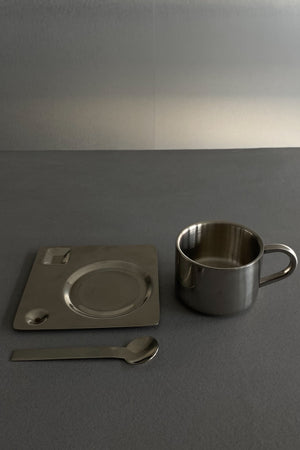 A modern twist on an iconic 80s Italian design. This vintage inspired 3-piece set features a stainless steel coffee cup with a round ear, paired with a square saucer and matching cute spoon. All engraved with the Obscur label on the bottom of the cup, tray and spoon for authenticity.