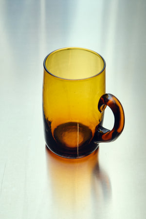 A set of four brown glass mugs inspired by mid-century modern design. Warm, earthy tones and timeless shapes make them functional, sculptural, and full of vintage character — perfect for everyday use or display.