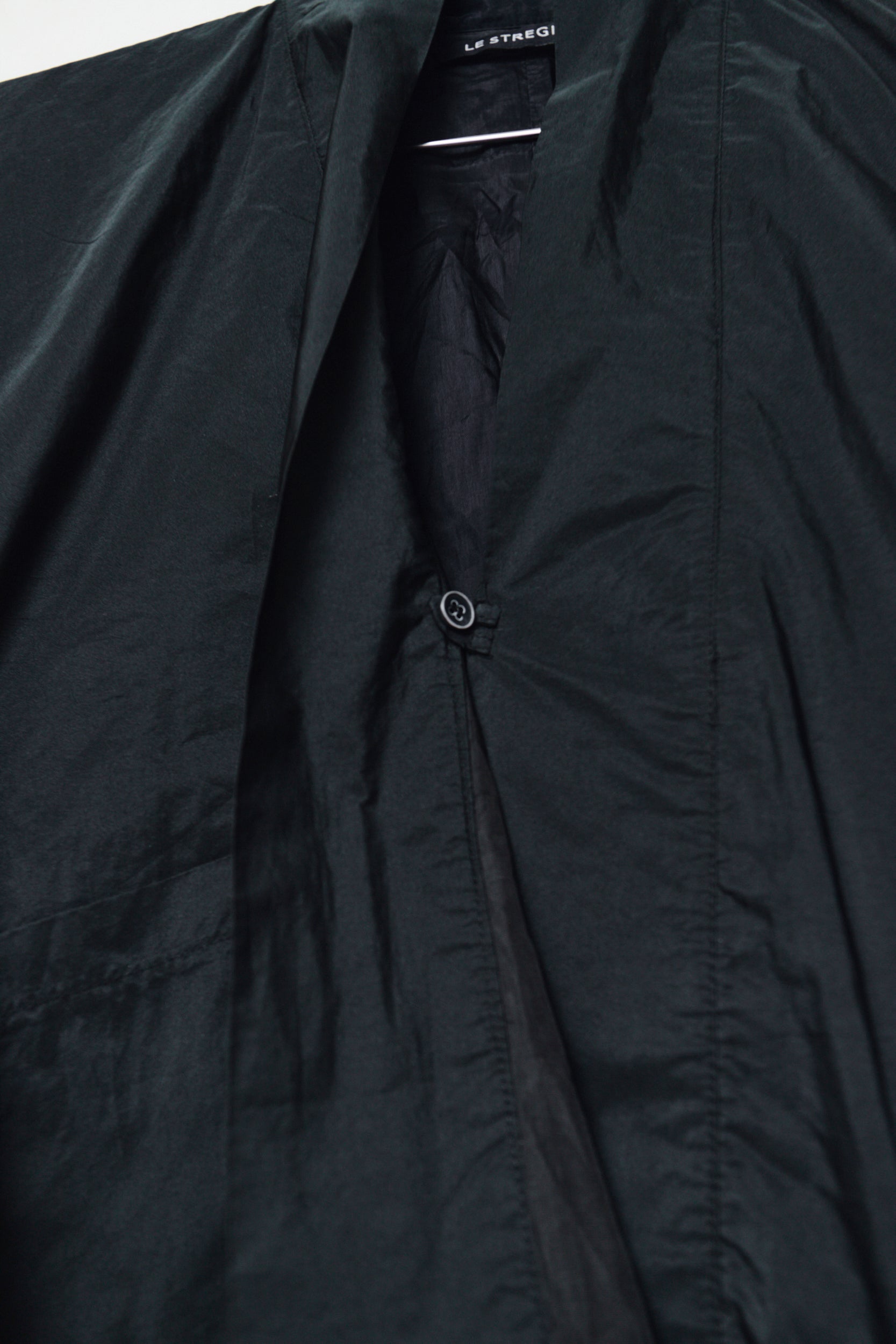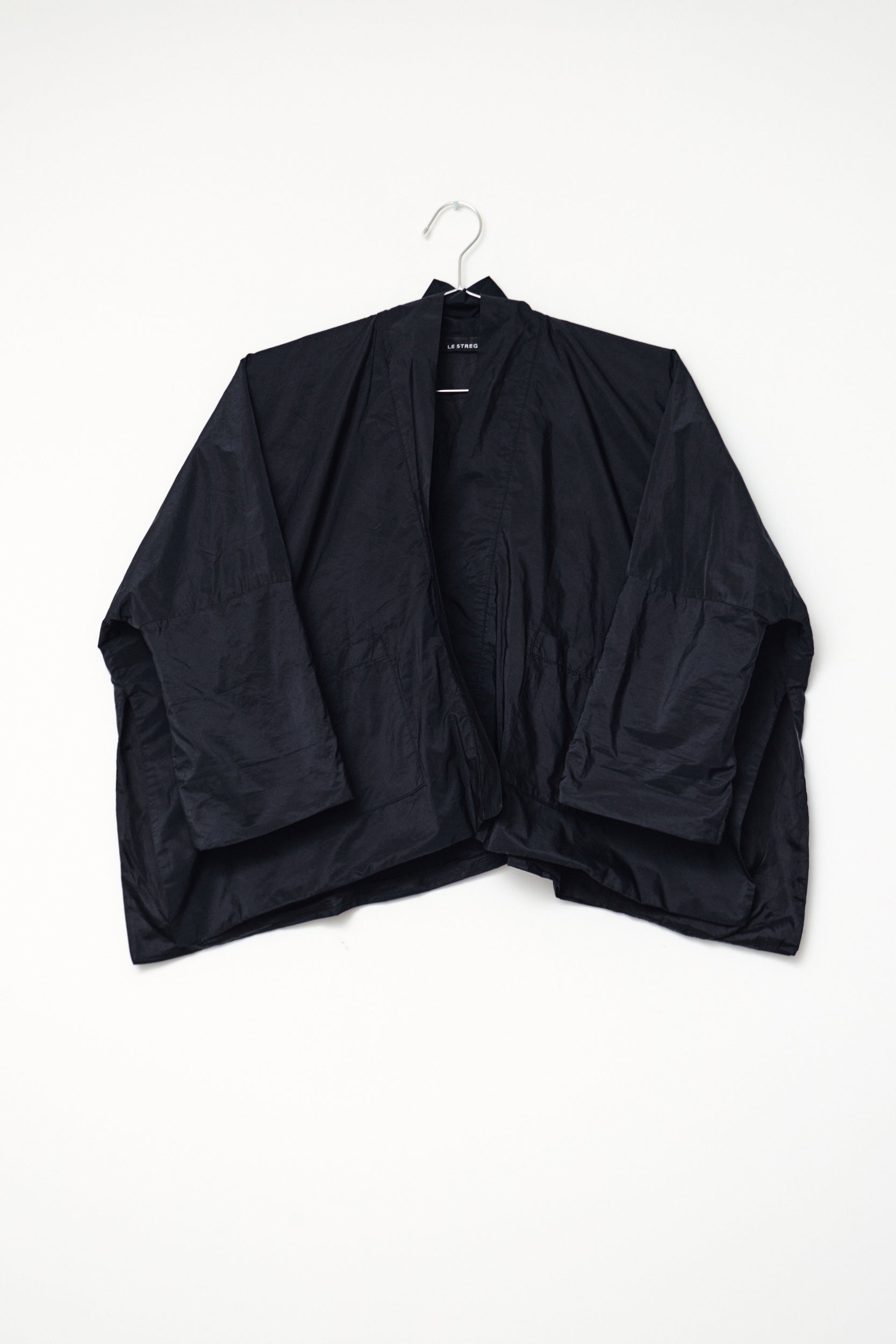 Kimono-style light jacket, cropped with 26 cm side slits, featuring gently flared elbow-length sleeves and two front pockets. Minimal yet sculptural, it can be worn as a top or layered as a light jacket.