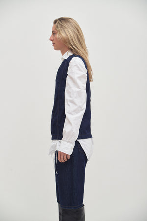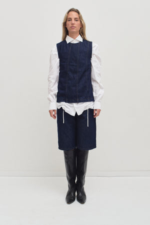 Dries Van Noten tailored denim set with a vest and bermudas. The vest features a structured silhouette, decorative stitching, and a back zipper closure, while the shorts offer a relaxed longer cut with matching stitched accents.