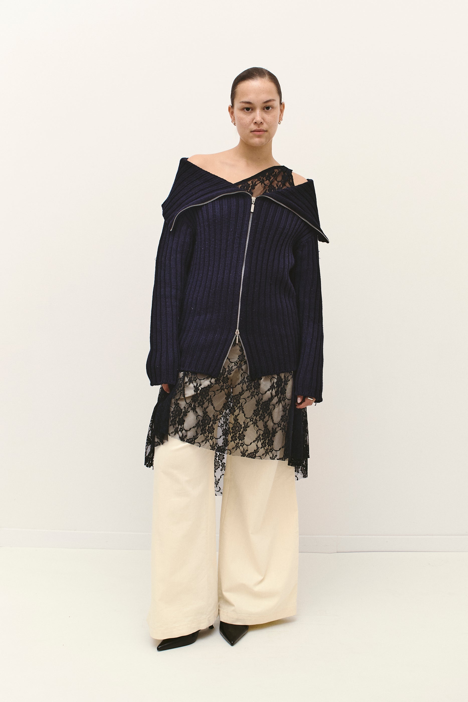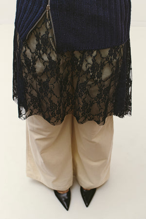 A sheer lace dress with a single shoulder design. Lightweight and a soft, romantic feel.