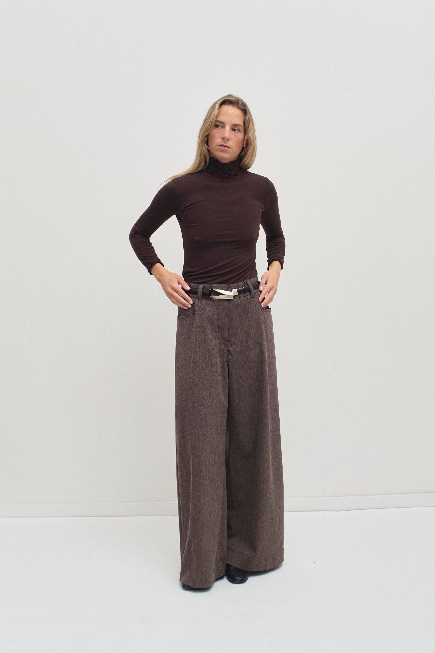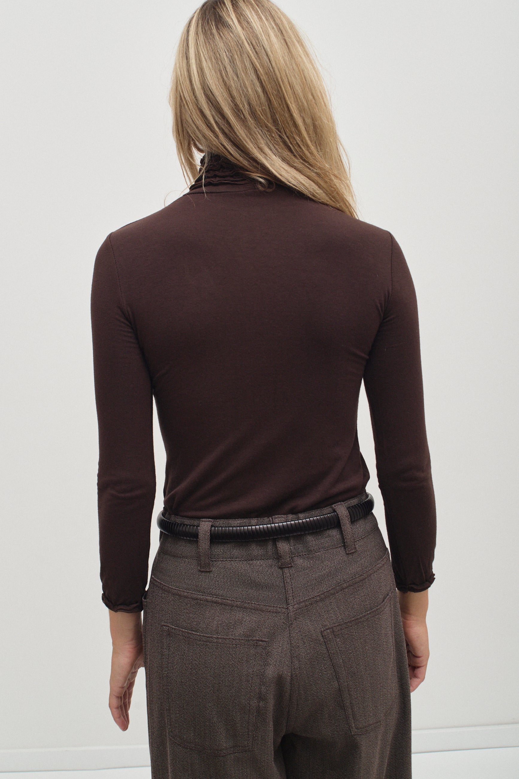Brown long-sleeve top crafted from a soft, stretchy fabric, featuring a ruffle-trimmed turtleneck and a fitted silhouette for an effortlessly chic and comfortable look.