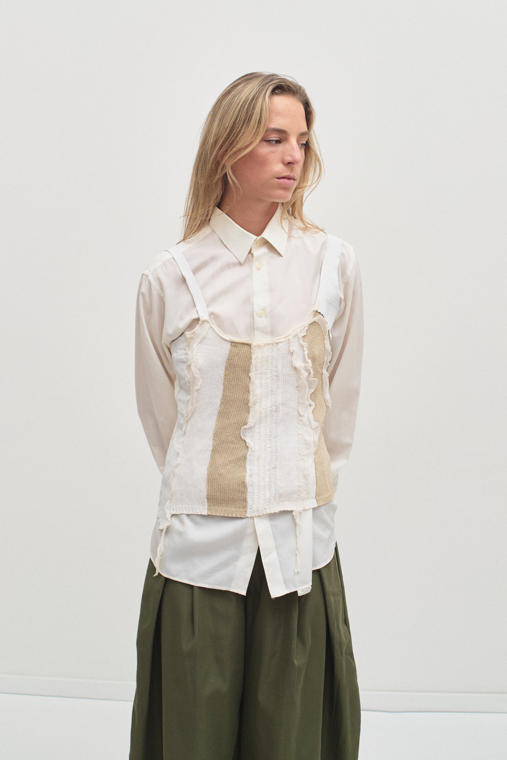Distressed knit top crafted from a mix of leather and cotton, featuring contrasting panels that highlight its textured design.