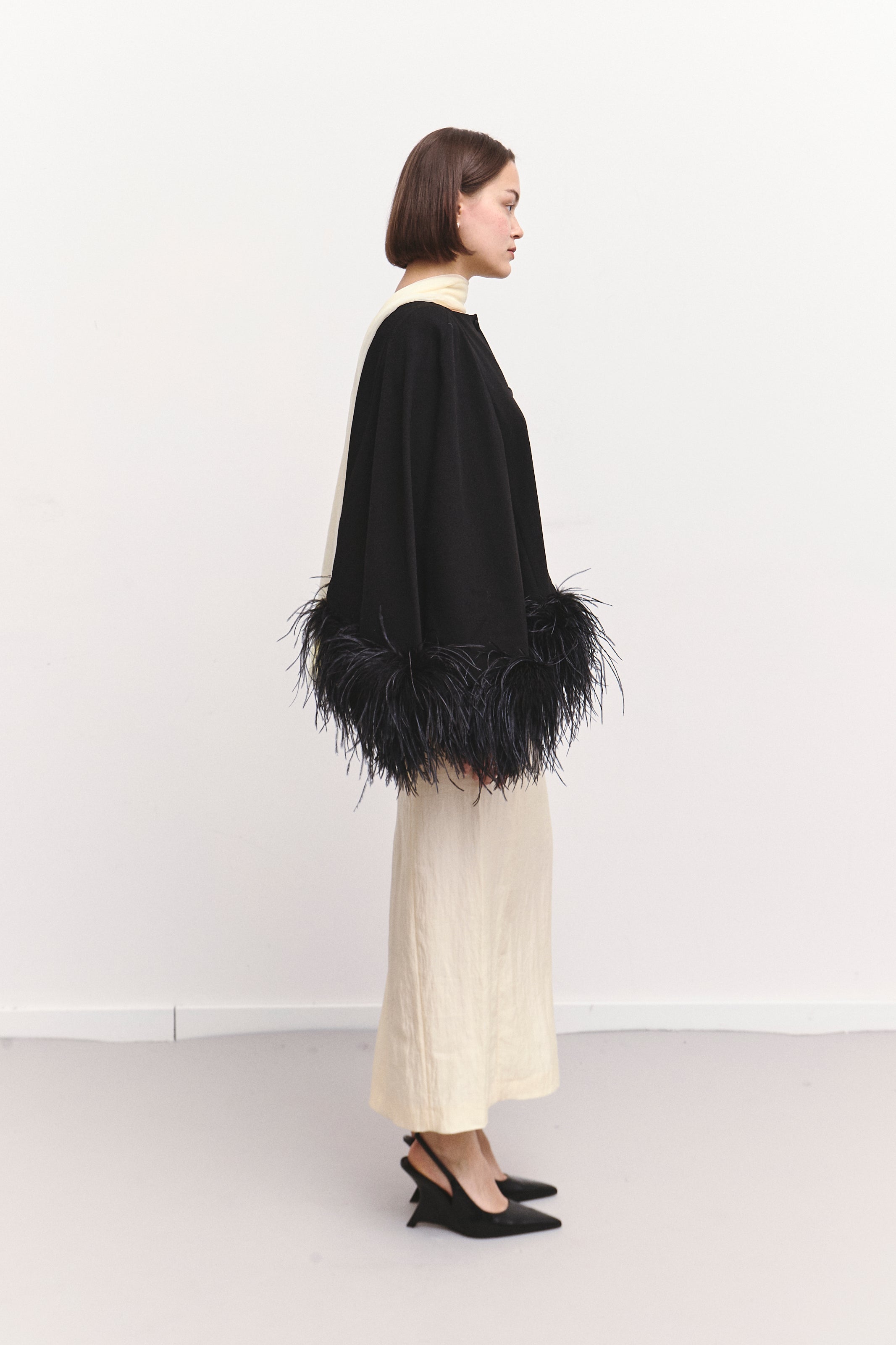 A black flowy cape featuring a smooth satin button closure and soft (real) marabou feathers trimming the entire edge. Elegant, lightweight, and designed to add a touch of drama to any outfit.