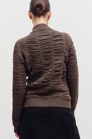 A structured knit jacket in a wool–acrylic blend with a sculptural ribbed texture throughout. Designed with a high neckline and a two-way zipper, allowing you to open it from the top or bottom for a more relaxed or shaped silhouette.Taupe/brown.