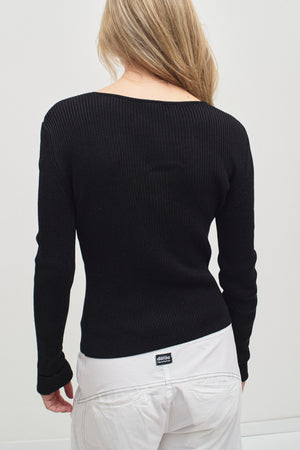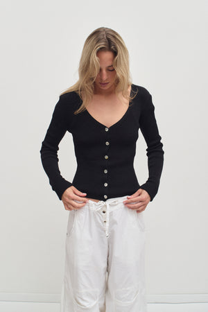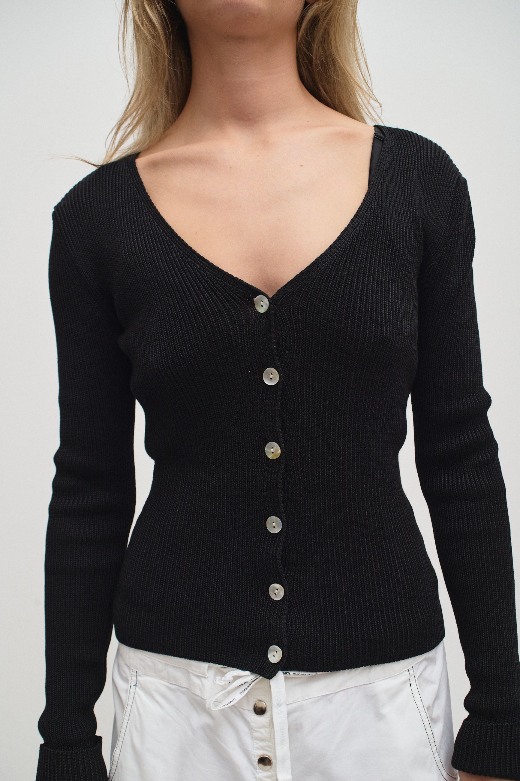 Black knit cardigan in a fine 1x1 rib, cut to a slim silhouette. Small shell-inspired buttons add quiet detail to the minimalist design.