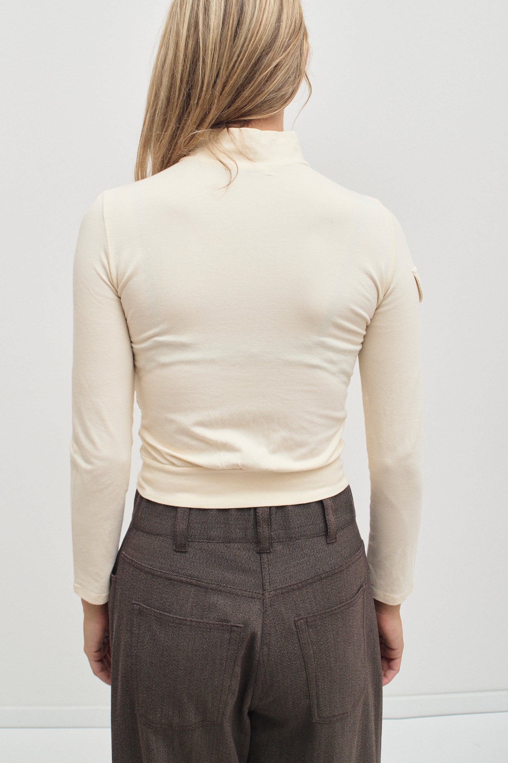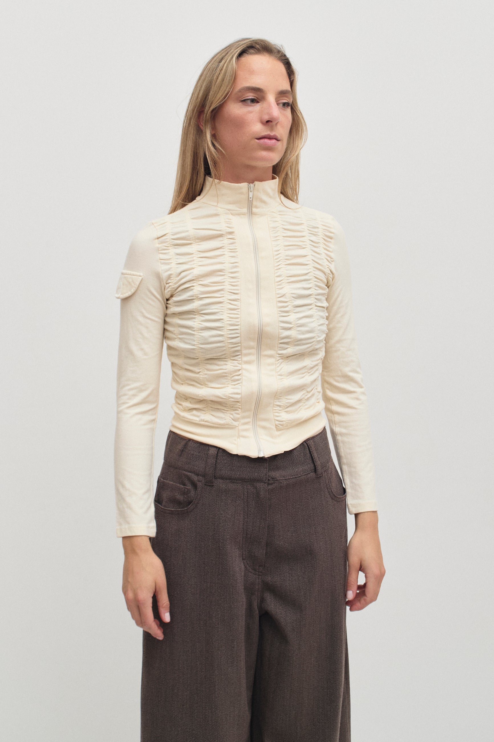 Soft smock zip-up top in cream white, textured through the front body. Can be worn open over a top or zipped up as its own piece.