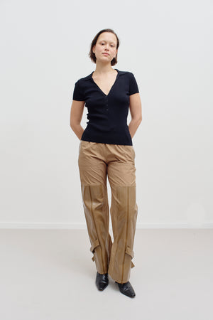 A minimal black polo top with a V-neck collar and buttons for an elevated look.