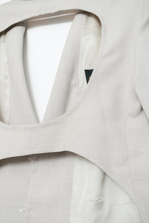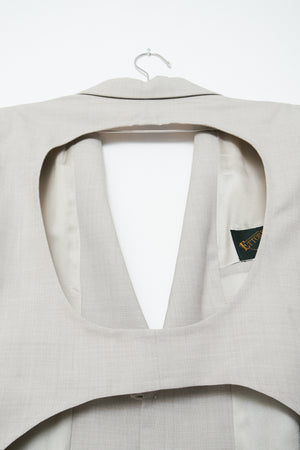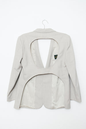 Upcycled design made from vintage blazers featuring a sleek open back.