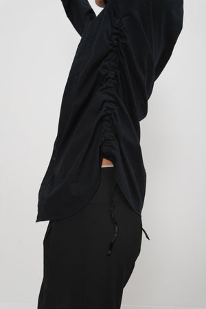 Upcycled shirt made from leftover stock shirts. Features adjustable side ruffles/drape. Black color.