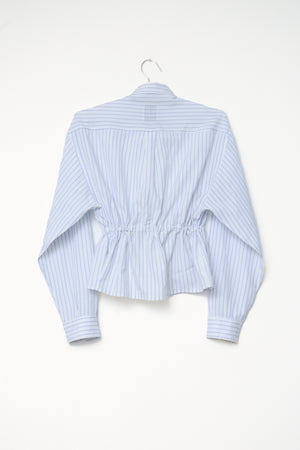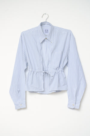 Features a clean front with neck button and adjustable smock detail on waist. Length is slightly cropped for a dainty silhouette on a relaxed fit/not oversized. Wear by itself or layer over a tank top/other shirts.