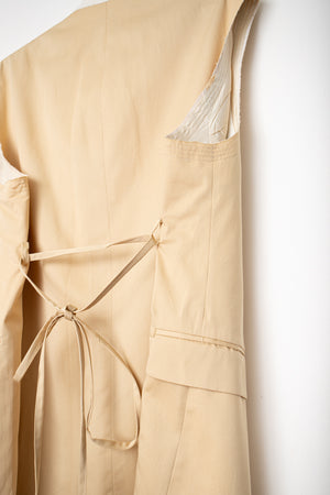 A blazer upcycled into a vest. ENSŌ design made from high-quality vintage. Features raw edge with exaggerated stitching on shoulder and a subtle extra long cord to create the desired look by cinching the waist. Belt is removable.