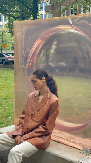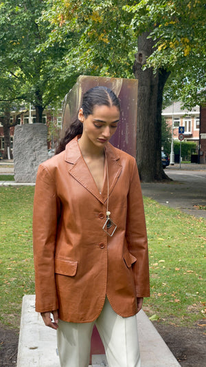 Single-breasted leather blazer in warm chestnut brown. Designed with notch lapels, button closure, and a softly relaxed fit.
